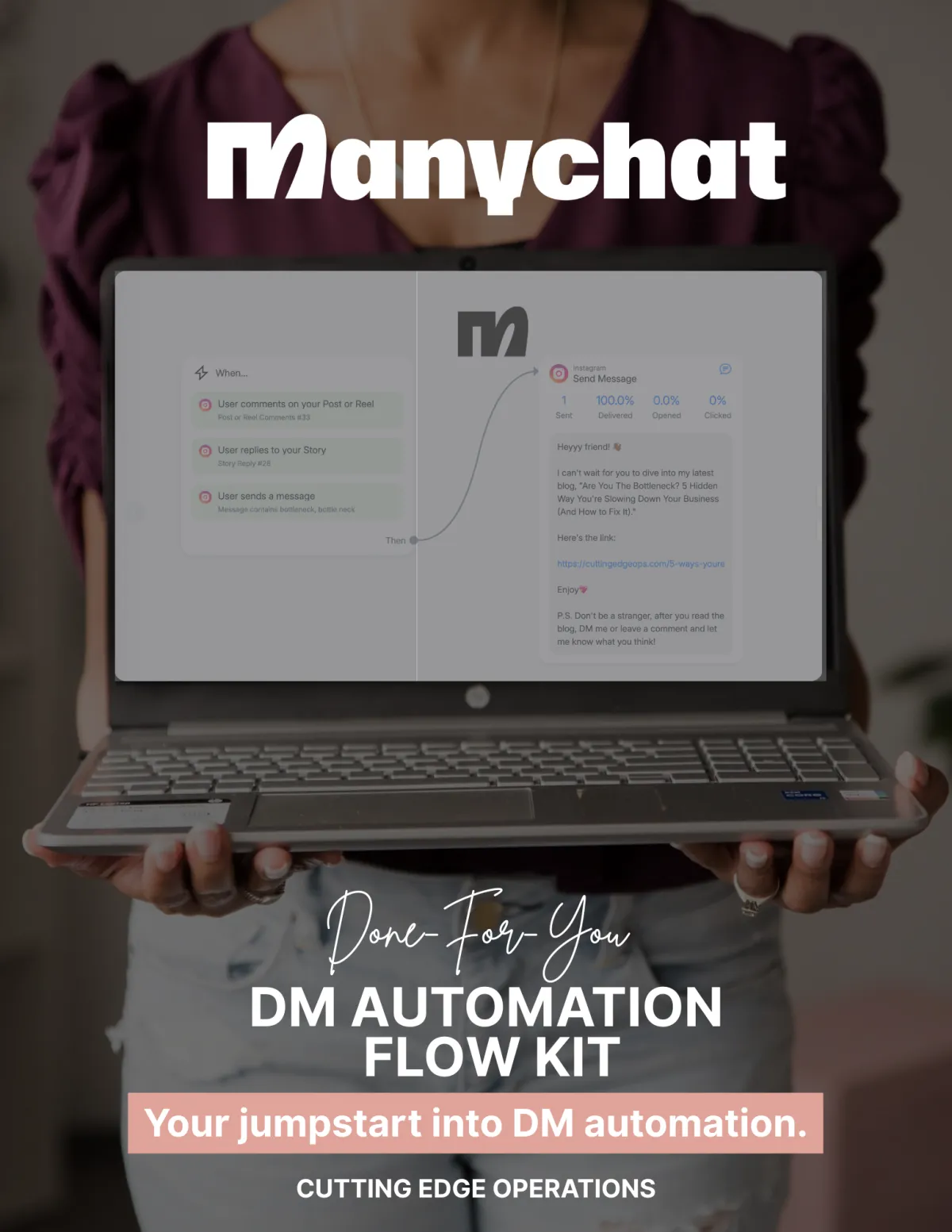 The Done-for-You ManyChat Flow Kit gives you pre-written DM templates and step-by-step walkthroughs so you can hit the ground running, save time, and start engaging leads efficiently — no guesswork required.
